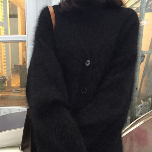 - 写真と見比べると、実物は毛量少なく見えるしペラいんですよぇ……あと、思ってたより袖が短かったので、下に来ている長袖インナーが袖からはみ出るんですよね〜 工夫して着ます
