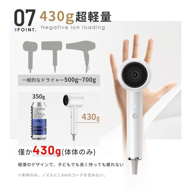 重さはペットボトル約1本と軽く、ドライ時間の腕への負担を軽減収納もかさばらず、インテリアにもなじみやすいテザインです。