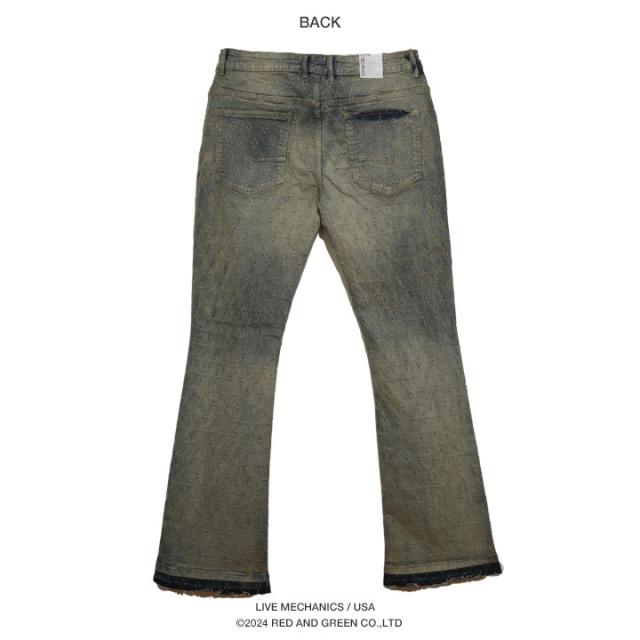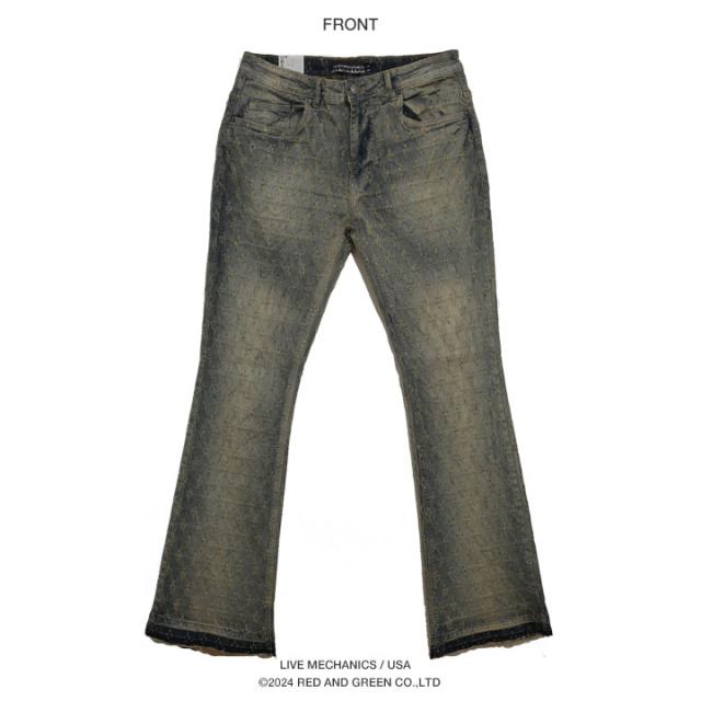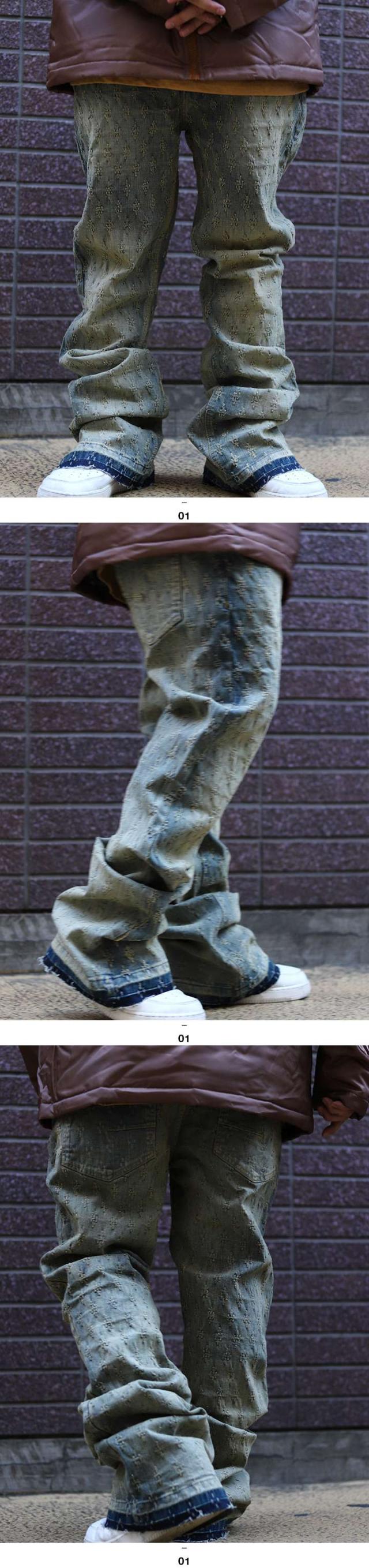 モノグラムデザインのダメージ加工を施したフレアタイプのデニムロングパンツ。
