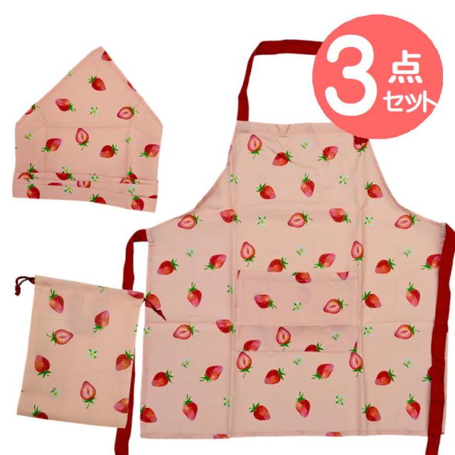 かわいいストロベリー柄のエプロン・三角巾・巾着の3点セット(ネームタグ付きで学校に持って行く時に便利です)