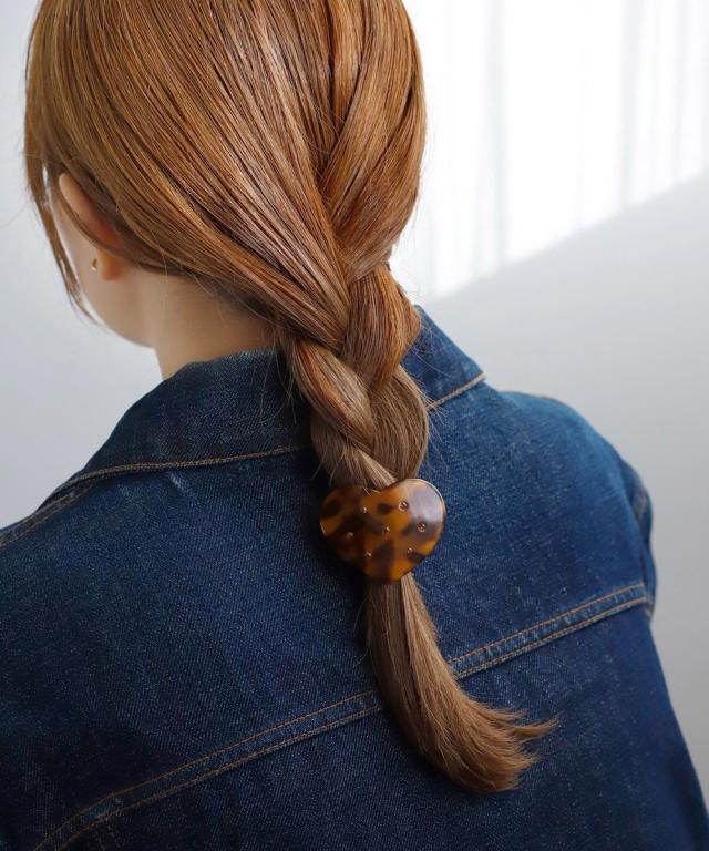 大ぶりのハートモチーフと煌めくビジューが、うしろ姿に華やかさを与えるヘアゴム。