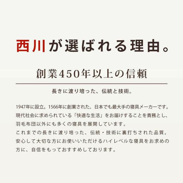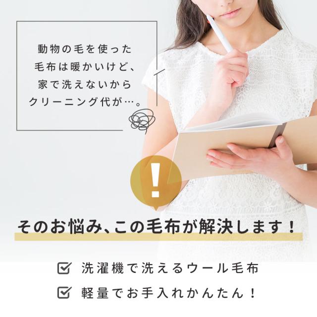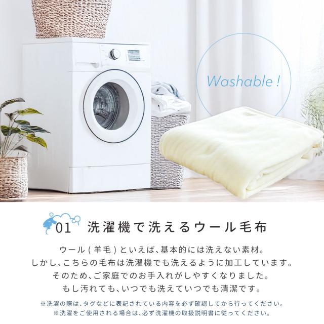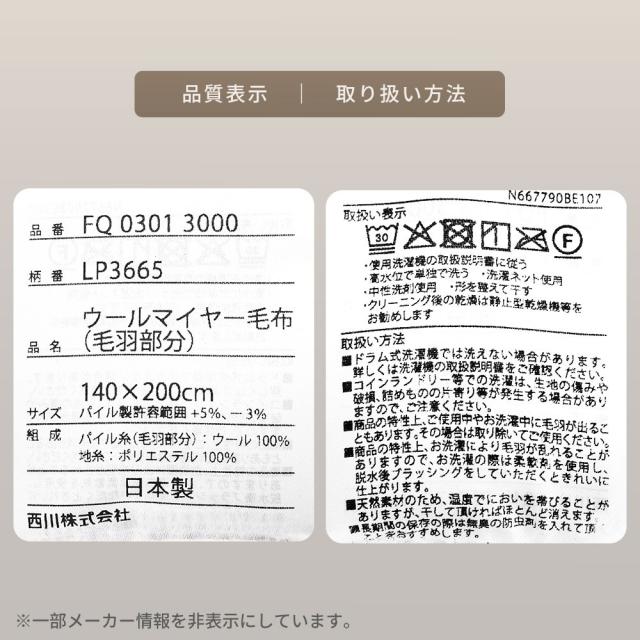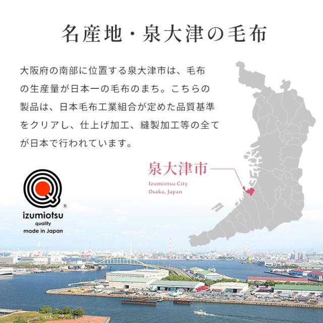 | ・洗濯機で洗えるウール毛布 肌にあたる部分は天然繊維100%。 肌にあたる部分はウール100%。 空気の含有量が高く熱伝導率が低いため、夏は涼しく、冬は暖か。 ウールは吸湿発散性に優れている快適な素材。 西川株式会社は、1566年創業の日本有数の寝具メーカー。 大阪府の南部に位置する泉大津市は、毛布の生産量が日本一の毛布のまち。 | |