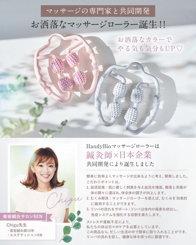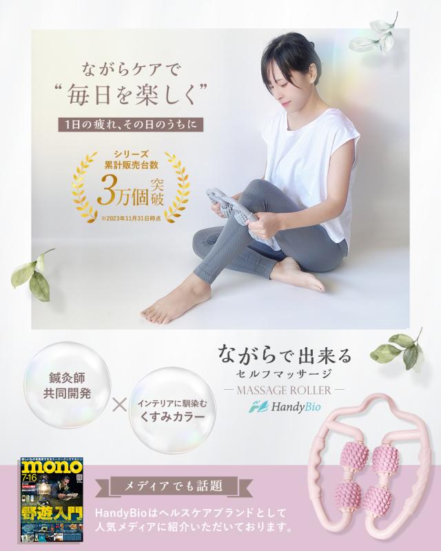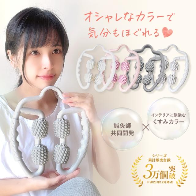 マッサージの専門家、鍼灸師の先生と共同開発により生まれたお洒落なマッサージローラー。おうち時間に気軽にセルフマッサージ出来るよう、インテリアに合う色味で開発しました。