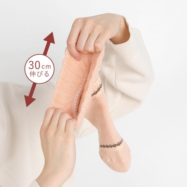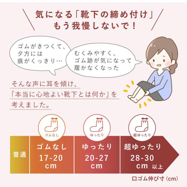 履き口部(口ゴム)が約30cm伸びる超ゆったり設計。足首ゆったりのタイプの靴下の中でも、かなりゆったりしたタイプになります。足首をしめつけず、むくみが気になる方にもおすすめです。