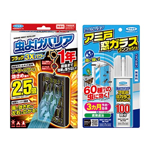 虫よけバリア ブラック 3Xパワー ベランダ用 虫除けプレート 無香料 (365日用) + アミ戸窓ガラスワンプッシュ 100回分フマキラー ベランダ虫対策セット