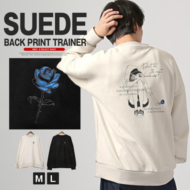 トレーナー メンズ レディース スウェット バックプリント バラ【薔薇刺繍ガールイラストバックプリントスエードトレーナー】 aa-3281