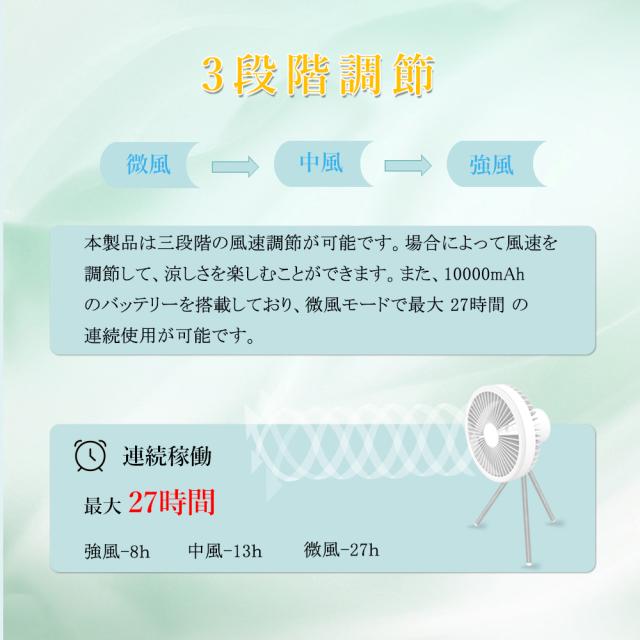 - このファンには微風、中風、強風三段階の風速を自由に調節できます。微風モードでは、ファンの風は自然の風に似て、爽やかで心地よく、睡眠時に最適です。中風モードでは風力が強まり、作業や読書にぴったり!強風モードでは力強い風が吹き、アウトドアでの使用に最適です。