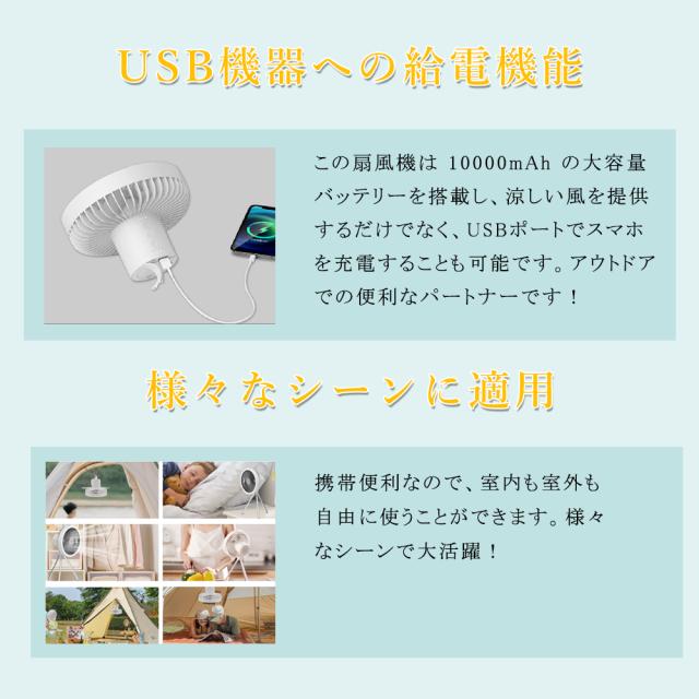 - わずか4.5時間の充電で、風量に応じて約27時間(弱風)、13時間(中風)、8時間(強風)の長時間連続稼働が可能です。これにより、日常生活やアウトドア活動のさまざまなシーンで活躍します。また、USBポートでスマホを充電することも可能です。