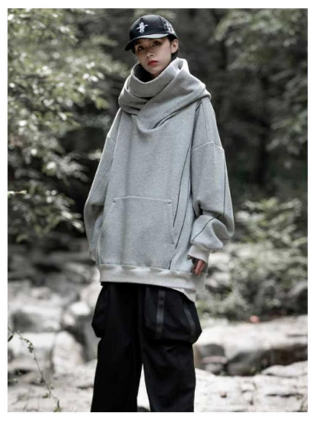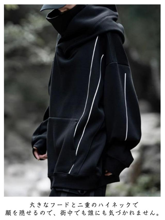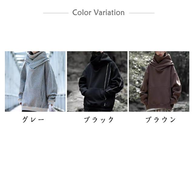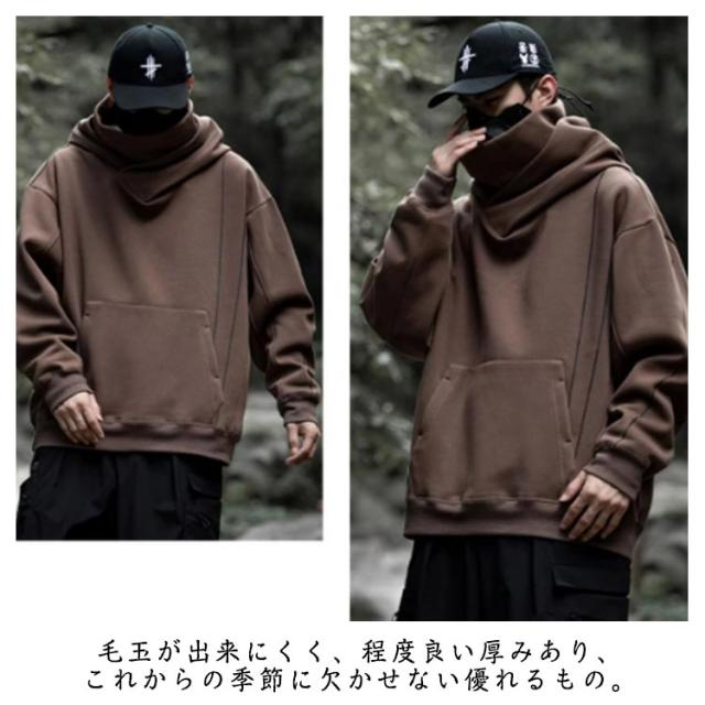 | かっこよく着られる男女兼用ハイネックパーカー。 大きなフードと二重のハイネックで顔を隠せるので、街中でも誰にも気づかれません。 ドロップスリーブとゆったりとしたサイズ感でどんなアイテムとも合わせやすい。 毛玉が出来にくく、程度良い厚みあり、これからの季節に欠かせない優れるもの。 | |