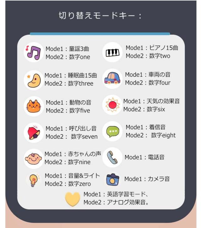 | 【赤ちゃんを飽きさせない多機能スマートフォンおもちゃ】さまざまな種類の電子音やミュージックで、はじめてテクノロジーにふれる赤ちゃんは楽しみながら知力をのばすことができます。スマホやリモコンに興味を持ち始めたお子様にぴったり!感覚的な遊びと操作的な遊びができます。 【プレゼントにも最適】 出産祝いやお誕生日、初節句、クリスマス、入園のお祝いなどの贈り物にもぴったりです。ご友人やお知り合いなど大切な方へのお祝い事のプレゼントとしても大変喜ばれますよ♪なるべく早く英語に触れさせたい方にもおすすめです。 【0歳からの知育玩具】 はじめてのスマホは、0歳から遊べるかわいいスマホの知育玩具です。小さなお子さまの好奇心を刺激するカラフルなデザインで、お子さまの「目と手の協調性」「想像力」「聴覚の感性」などの発達を促す仕掛けがいっぱい詰まっています。ハイハイ期からお子さまの成長をサポートしてくれます。 【寝かしつけサポート】自然や単調な音が心地よく睡眠用の曲もあり、寝かしつけをサポートしてくれます。二段階に音量調節が可能で、赤ちゃんの耳にも優しい65デシベル未満の音量です。 【丈夫で安全な設計】 安全なABS樹脂を使用しており、尖った角などのない安全なデザインです。丈夫な作りで耐久性にも優れているので、小さなお子さまにも安心して遊ばせることができます。 | |