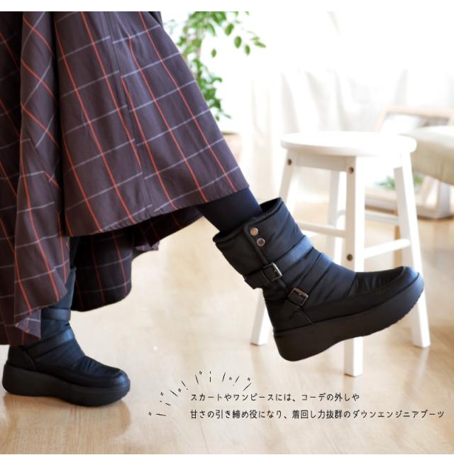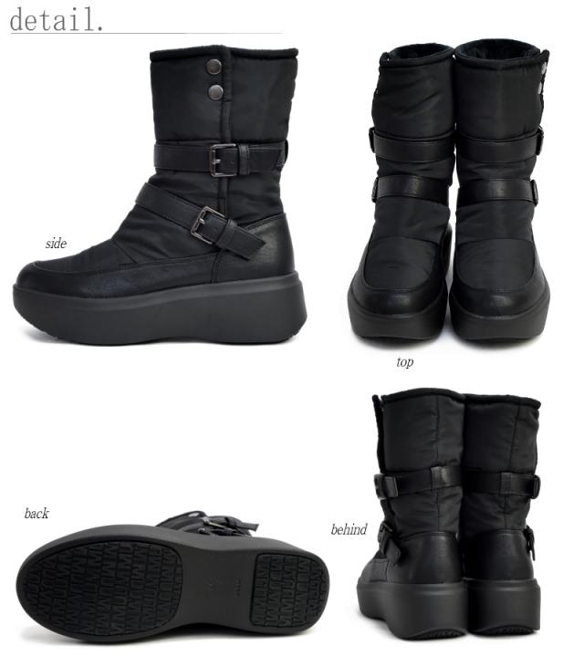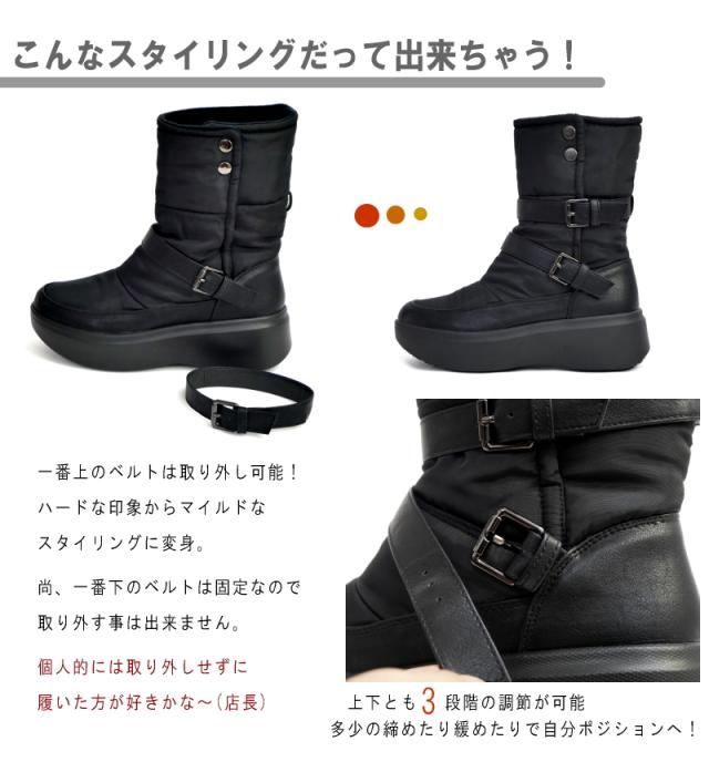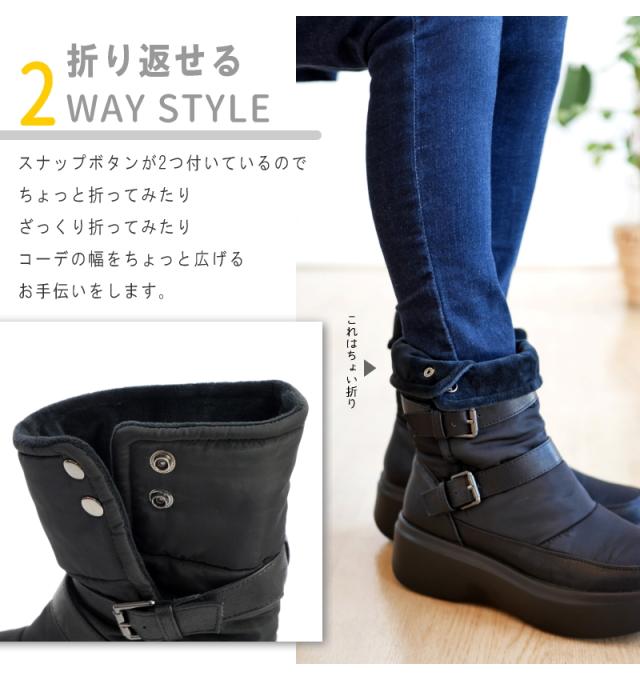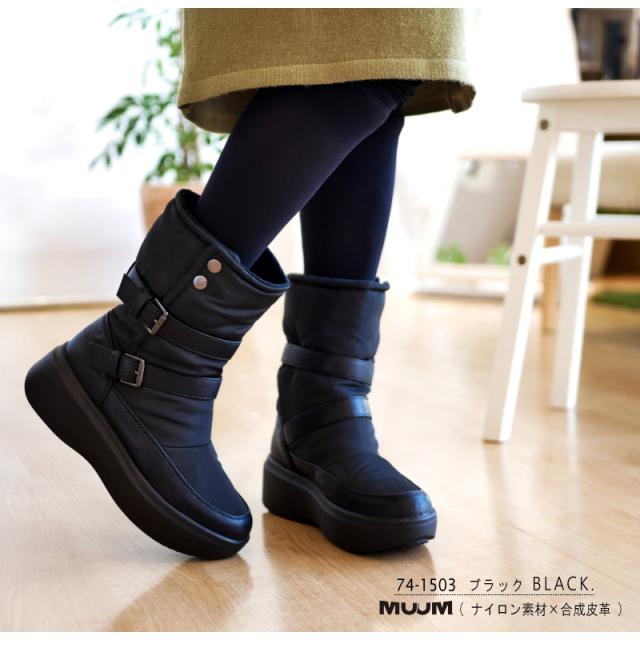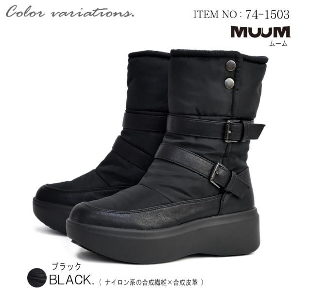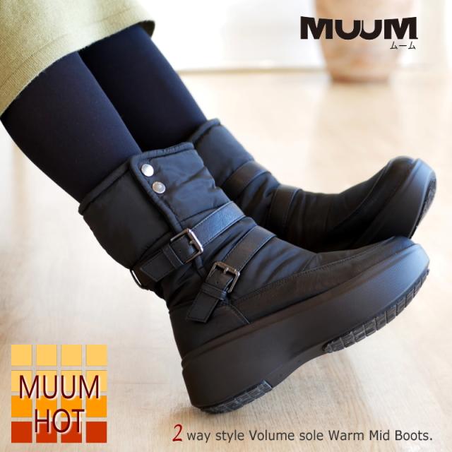 50%OFF MUUM ムーム ミドルブーツ レディース 2way 折り返せる ナイロン 暖かい 保温 ボア ボリュームソール フラット ラウンドトゥ 2ベルト 滑りにくい 黒 歩きやすい 履きやすい 旅行 3e