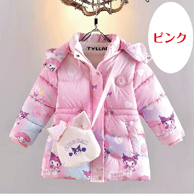 女の子 フード付きダウンコート ジャケット クロミちゃん メロディーちゃん サンリオ キュート 子供服 こども コットン 洗濯機 かわいいバッグ付き 100-150cm ピンク ブルー パープル 3色 冬 キュート 可愛い