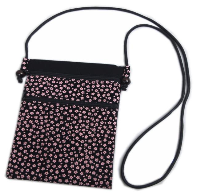 ポシェット バッグ ショルダー ロング 和柄 印伝調 2ファスナー 黒色地ピンク桜さくら 日本製 女性用 レディース メンズ 男性用 着物 浴衣