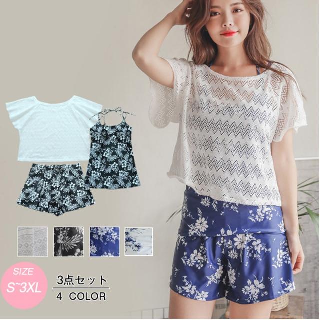 水着 レディース 3点セット ホルターネック タンキニ 体型カバー レディース水着 花柄 可愛い20代 30代 40代 ミセス 温泉 大きいサイズ