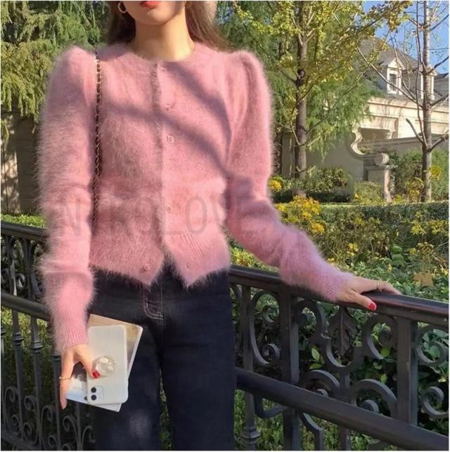 カーディガン レディース パフスリーブ 秋冬 ショット丈 フェイクミンクカーディガン クルーネック 無地 アウター 通勤 コーディガン 大人 上品