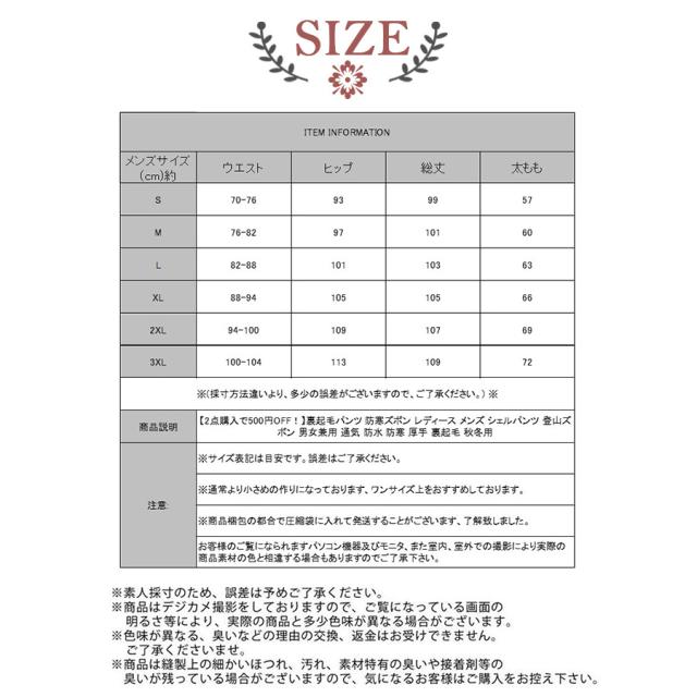 【2点購入で500円OFF!】裏起毛パンツ 防寒ズボン レディース メンズ シェルパンツ 登山ズボン 男女兼用 通気 防水 防寒 厚手 裏起毛 秋冬用