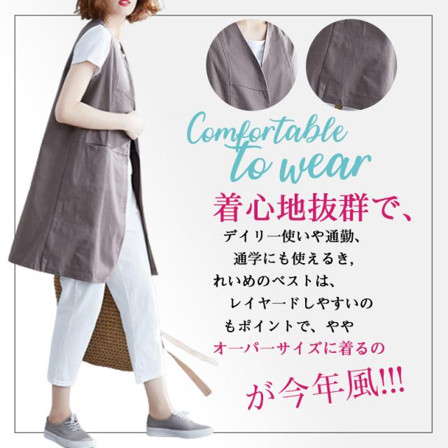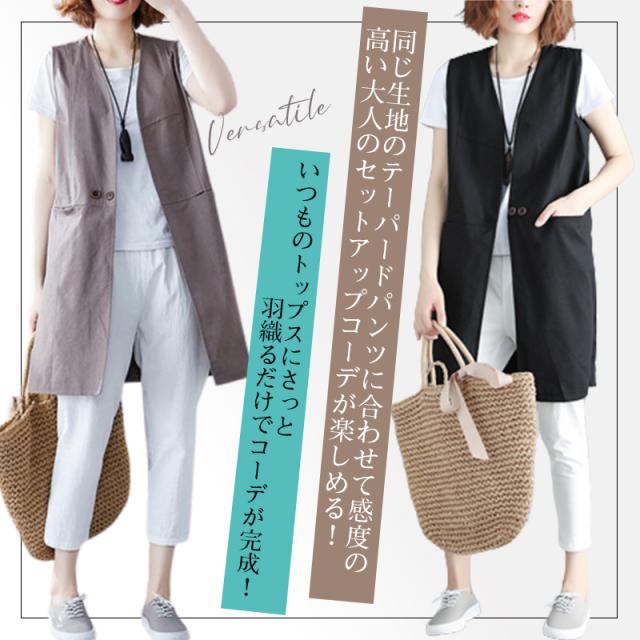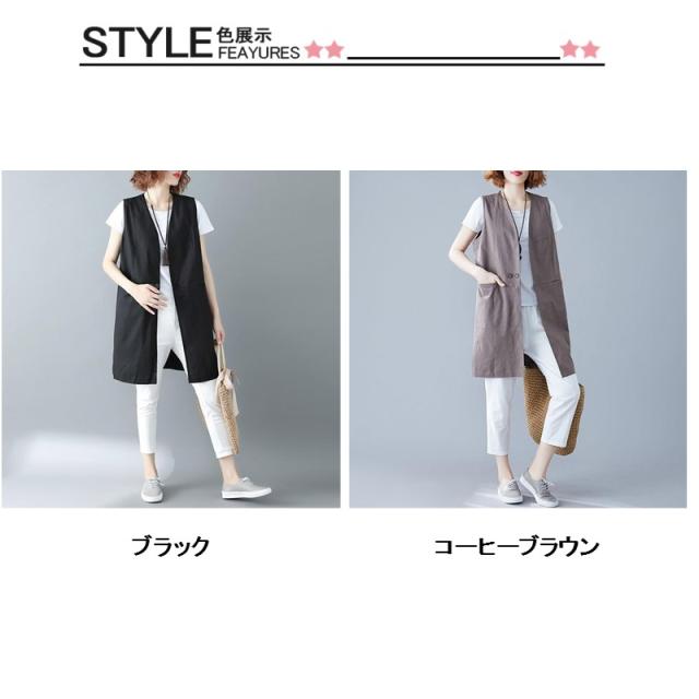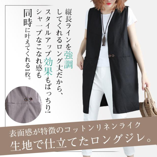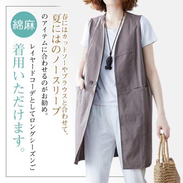 【2点で10%オフ】ベスト 春 リネンライクロングジレ ジレ ロングコートノースリーブ ロングジレ トレンチベスト 無地 綿麻 ロングベスト夏 大きいサイズ