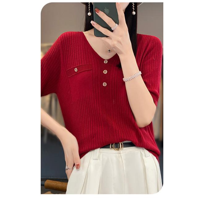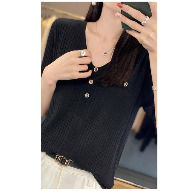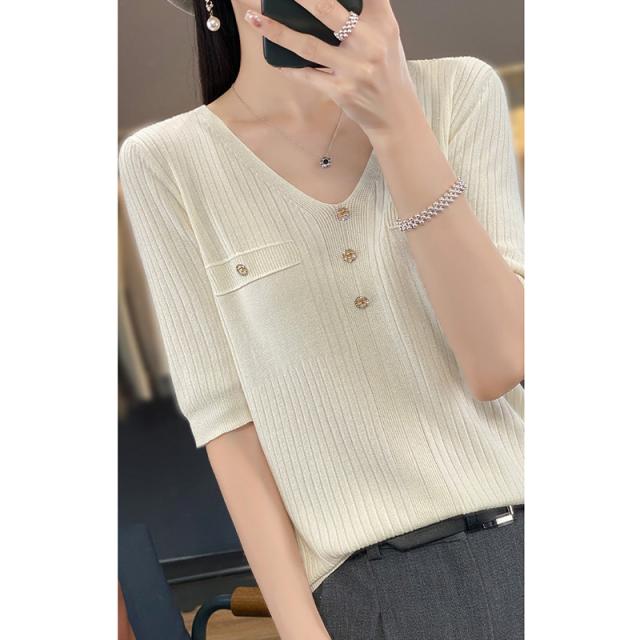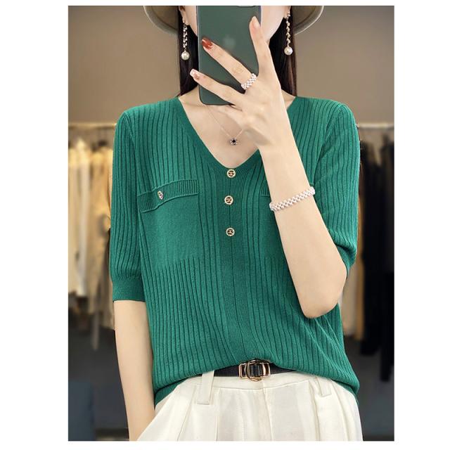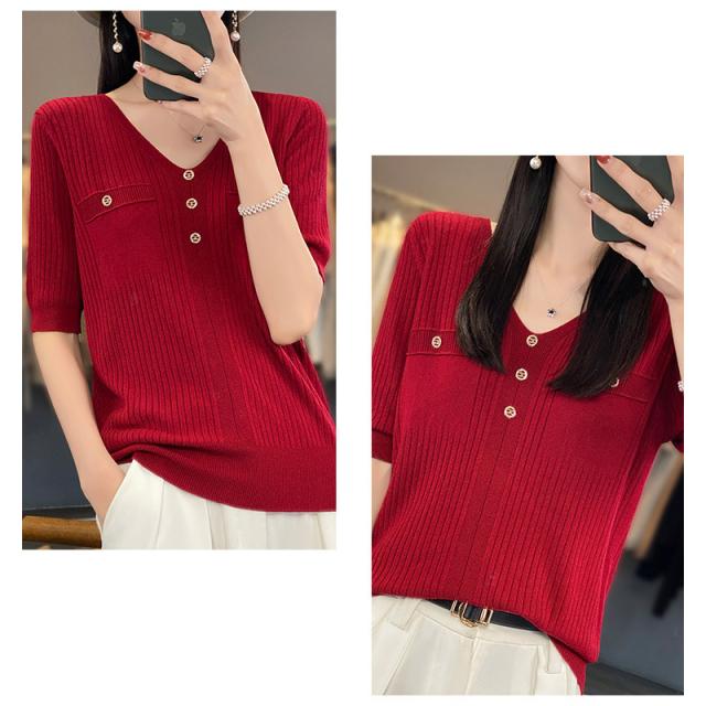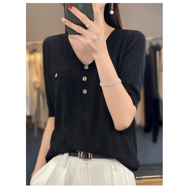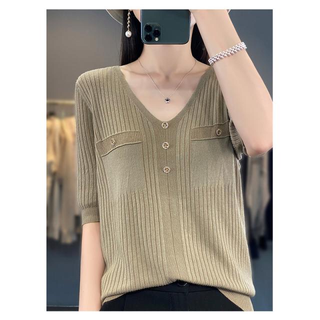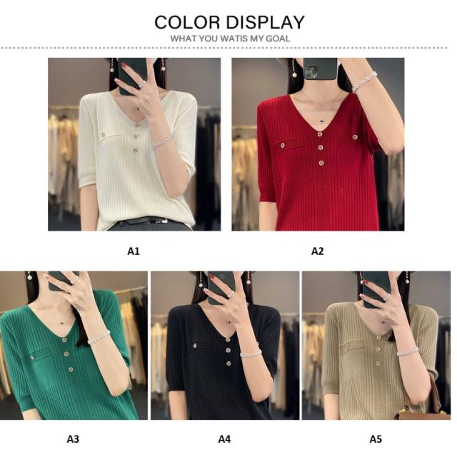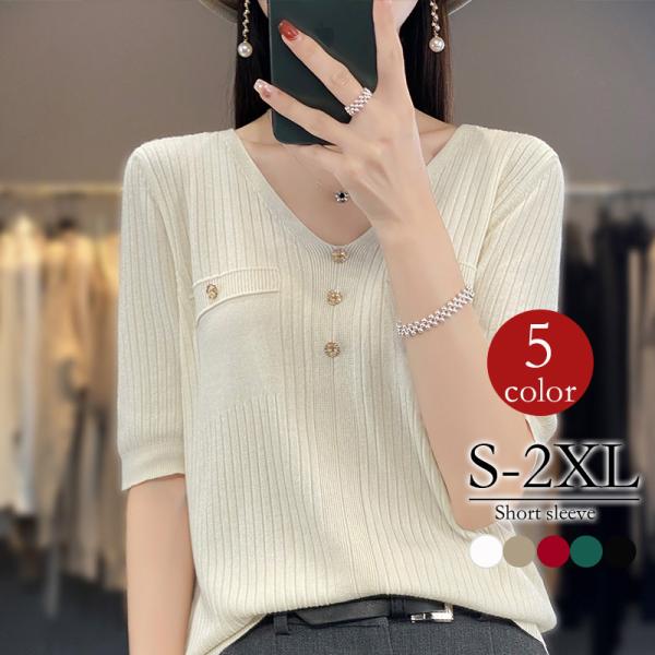 Tシャツ シャツ ニットシャツ ニット レディース 半袖 リブニット 薄手 ゆったり 無地 トップス 接触冷感 Vネック 涼しい 夏用 肌着 一部即納