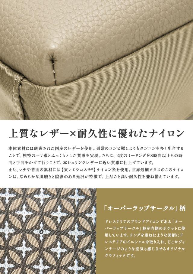 | レザーとナイロンをMIXした軽量カジュアルミニショルダーバッグ レザーとナイロンを同色でMIXした、ドレステリアのカジュアルミニショルダーバッグ。約410gと超軽量設計で、長財布がぴったり収まるコンパクトなサイズ感が魅力です。シンプルながらも洗練されたデザインで、男女問わずユニセックスでお使いいただけます。 ちょうどいい収納力 メインルームは長財布がちょうど収まるサイズ感で、内側には小物類を収納できるファスナーポケットが1つあります。外側には前面ファスナーポケットがあり、その中にも小物類の整理に便利なポケットが1つ、背面にもファスナーポケットがあり、スマホなどのすぐに取り出したい物の収納に便利です。コンパクトでありながら日常使いにちょうど良い収納力を備え、スマートに持ち運びが可能なミニショルダーバッグです。 整理しやすい収納ポケット ・前面ファスナーポケット(内側にポケット) ・メインルーム背面ポケット ・背面ファスナーポケット ドレステリアのブランドアイコンである「オーバーラップサークル」柄を内側のポケットに使用しています。リングを重ねたような図柄にドレステリアのイニシャルを取り入れ、どこかヴィンテージのような空気も感じさせるオリジナルグラフィックです。 上質なレザー×耐久性に優れたナイロン 本体素材には厳選された国産のレザーを使用。通常のコンビ鞣しよりもタンニンを多く配合することで、独特のハリ感とふっくらとした質感を実現。さらに、2度のミーリングを8時間以上もの時間と手間をかけて行うことで、本シュリンクレザーに近い質感に仕上げています。 また、マチや背面の素材には【東レミラコスモ®】ナイロン糸を使用。世界最細クラスのこのナイロンは、なめらかな肌触りと陰影のある光沢が特徴で、上品さと高い耐久性を兼ね備えています。 驚きの軽さで快適な使用感 レザーとナイロンを組み合わせることで、重量が「約410g」と軽量なのも魅力です。長時間の使用でも肩に負担がかかりにくく、持ち歩きが多いシーンでも快適に使用できます。 |