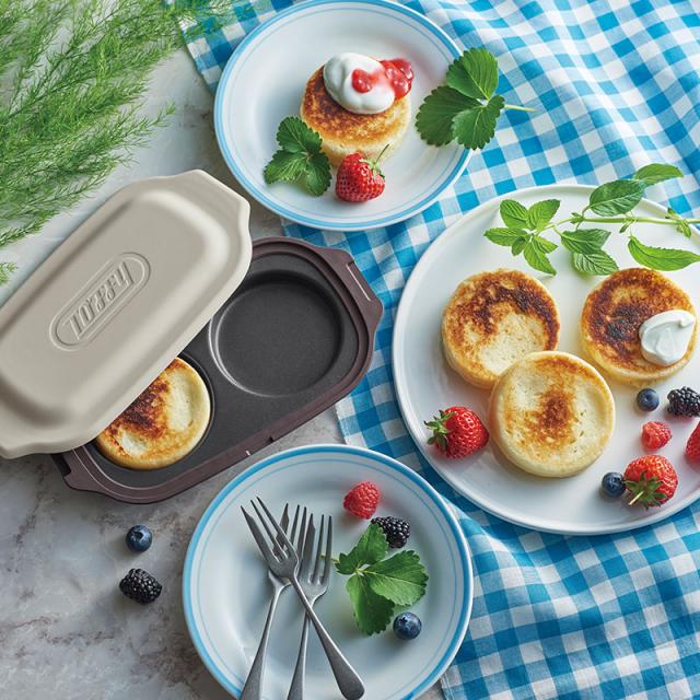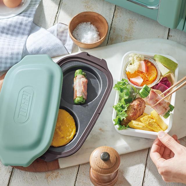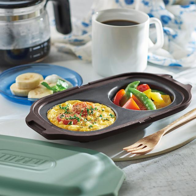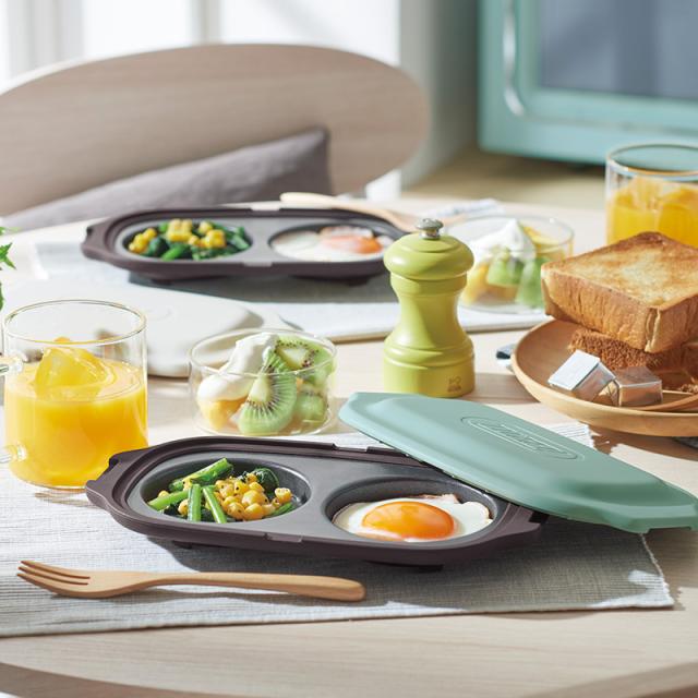 電子レンジに入れるだけで、グリルのような焼き目が付いて、目玉焼きもふっくらとおいしい仕上がりになるダブルグリルプレート。2品を同時に調理することができるので、忙しい朝も大助りです。