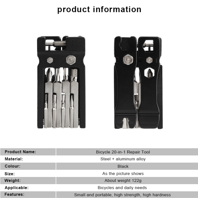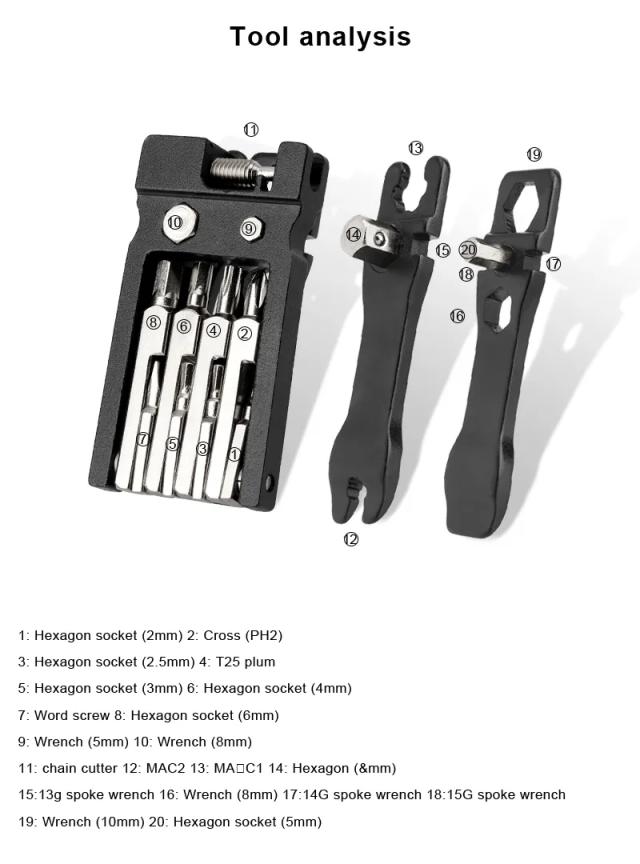? 多機能ツールキット :このツールキットには、チェーンカッター、スポークレンチ、ドライバーが含まれているため、自転車を修理するための多用途のツールセットになっています。
