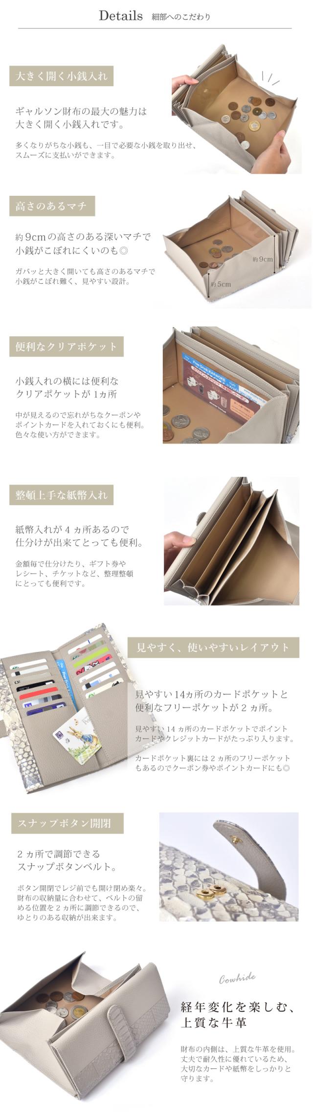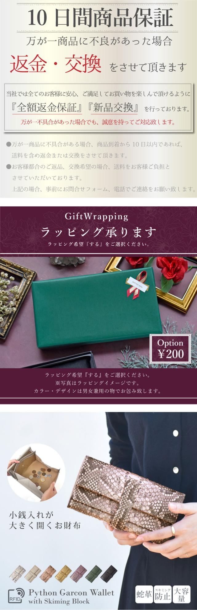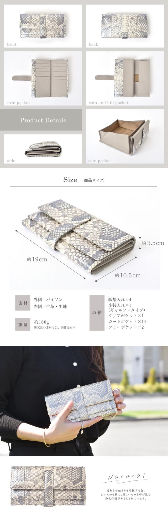 | 特徴 | 天然の優しい手触りと美しさ 使うほどに美しい艶、色味に深みが生まれます パイソンの特徴はこの個性的で美しいウロコ模様にあります。 ラグジュアリーな雰囲気があり、エキゾチックレザーならではの表情をお楽しみ頂けます。 繊細な見た目ではありますが、鱗が剥がれたりする事はありません。 使うほどに何とも言えない色味に深みが生まれ、艶が増していきます。 艶やかなパイソン本革に、繊細なパール加工が加わり、洗練されたデザインに仕上がりました。 控えめな光沢が持つ人の個性を引き立てます スキミング防止機能搭載 特殊なフィルムを革や生地の間に挟む事で外部からの電波干渉を防ぎます。 『目に見えないスリ』から情報を守るスキミング防止機能は現代社会のマスト機能です。 ◇ギャルソン財布、嬉しい7つの特徴◇ ◆ギャルソン財布の最大の魅力は大きく開く小銭入れです。 多くなりがちな小銭も、一目で必要な小銭を取り出せ、スムーズに支払いができます。 ◆約9cmの高さのある深いマチで小銭がこぼれにくい ガバッと大きく開いても高さのあるマチで小銭がこぼれ難く、見やすい設計。 ◆小銭入れの横には便利なクリアポケットが1ヵ所 中が見えるので忘れがちなクーポンやポイントカードを入れておくにも便利。 色々な使い方ができます。 ◆紙幣入れが4ヵ所あるので仕分けが出来てとっても便利。 金額毎で仕分けたり、ギフト券やレシート、チケットなど、整理整頓にとっても便利です。 ◆見やすい14ヵ所のカードポケットと便利なフリーポケットが2ヵ所。 ポイントカードやクレジットカードがたっぷり14枚入ります。 カードポケット裏には2ヵ所のフリーポケットもあるのでクーポン券やポイントカードにも◎ ◆2ヵ所で調節できるスナップボタンベルト。 ボタン開閉でレジ前でも開け閉め楽々。財布の収納量に合わせてベルトの留める位置を2ヵ所に調節できるので、 ゆとりのある収納が出来ます。 ◆経年変化を楽しむ、上質な牛革 財布の内側は、上質な牛革を使用。丈夫で耐久性に優れているため、大切なカードや紙幣をしっかりと守ります。 ◇お財布の色が持つ意味 財布の色には、それぞれが持つ意味や、風水で考えられる効果があると言われています。 ご自身の願いやイメージに合わせて、お財布の色を選んでみてはいかがでしょうか。 〇ナチュラル(白):純粋さや始まりを象徴する色。古いものを捨て、新しいものを呼び込む浄化作用があるとされています。 〇グレージュ:グレーとベージュが混ざり合った色。落ち着きと安定感を与え、仕事運アップに繋がる効果が期待できます。 〇ピンク:愛や平和を象徴する色。恋愛運や人間関係の円滑化に繋がる効果が期待できます。 〇ゴールド:金運を呼び込む代表的な色。太陽の色としても捉えられ、ポジティブなエネルギーをもたらすと考えられています。 〇パープル:高貴さや神秘性を象徴する色。直感力や創造性を高め、目標達成をサポートすると考えられています。 〇グリーン:成長や豊穣を象徴する色。金運向上や仕事運アップに繋がる効果が期待できます。 〇ブラック:成功や安定を象徴する色。浪費を抑え、貯蓄に繋がる効果が期待できます。 ※“革の表情”について、ご購入前にご確認下さい。 本製品は天然の素材を使用しておりますので、キズやシワなども入っている場合がございます。 これらは本革ならではの個体差によるものと、2つとない表情を魅せる革の個性であるため、 風合いをお楽しみ頂けると幸いでございます。 ※ひどく目立つものは除いて、ある程度は革の個性としてそのまま出荷・発送致します。 ※黒点 汚れ・鱗のゆがみ・色ムラ・鱗の大小あり・鱗浮き・革切れ・革スレ・小傷のような革の個性による返品・交換は原則お受け致しかねますので、予めご了承下さいませ。 (上記のような症状は使用する程に、徐々に革が馴染み目立ちにくくなっていきます。) |