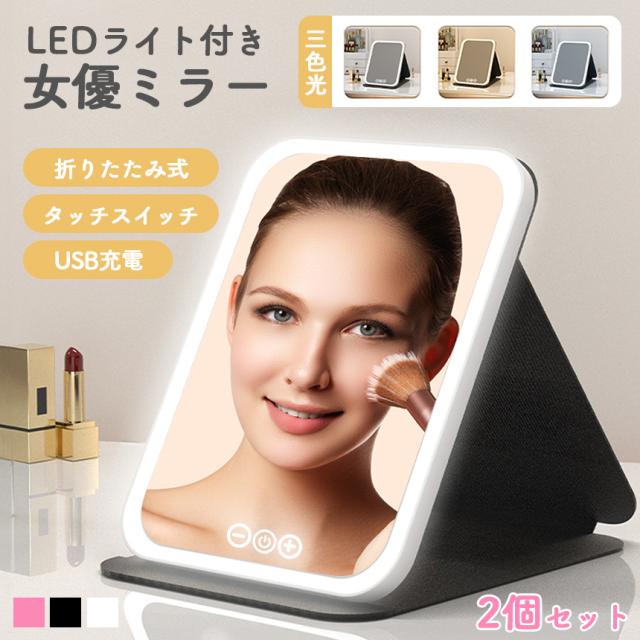 女優ミラー 日光女優ミラー 2個セット 卓上ミラー 化粧鏡 卓上 鏡 ライトミラー LEDミラー メイクミラー ライト付きミラー USBサポート式 携帯型ミラー 折り畳み式 三色光源 折りたたみ式 折りたたみ USB Type-C ブラック ホワイト ピンク 明るさ調節 タッチボタン LED