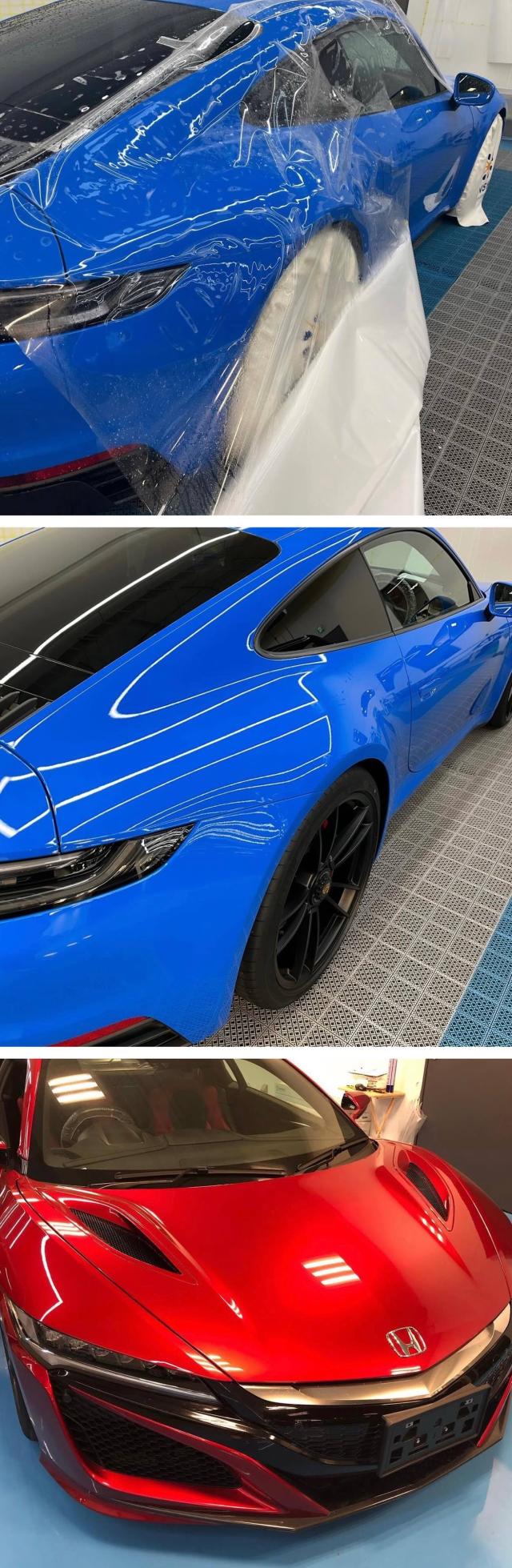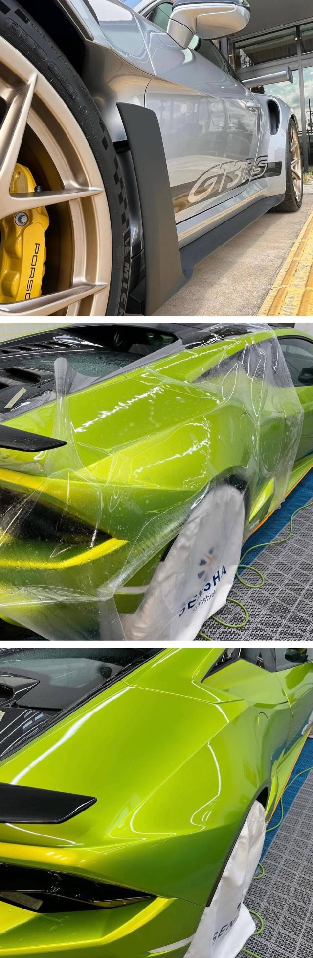 従来のPVCフィルムに比べ、曇りや黄ばみが少なく、塗装本来の色味や艶、メタリックの輝きをそのまま表現します。