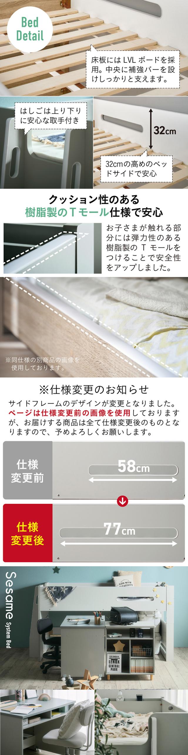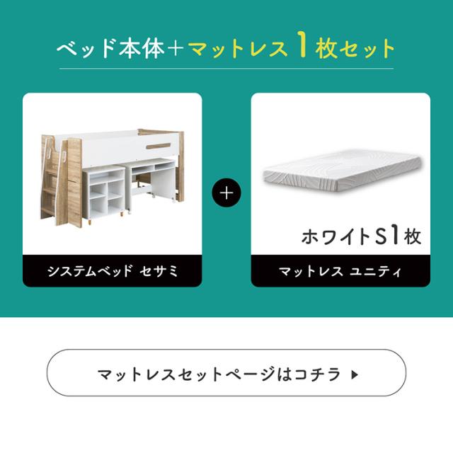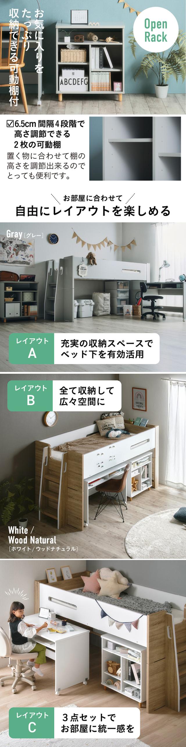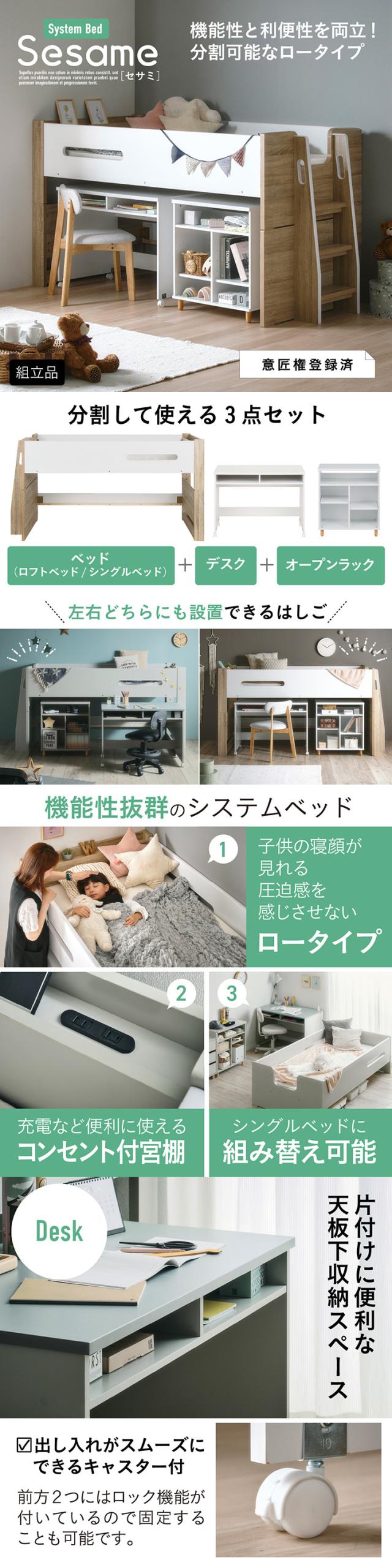 システムベッド ロフトベッド シングルベッド 子供 ロータイプ 階段 木製 キャスター付き 学習机 オープンラック おしゃれ シンプル ナチュラル コンパクト 北欧 組み替え可能 Sesame(セサミ) 3点セット 2色対応