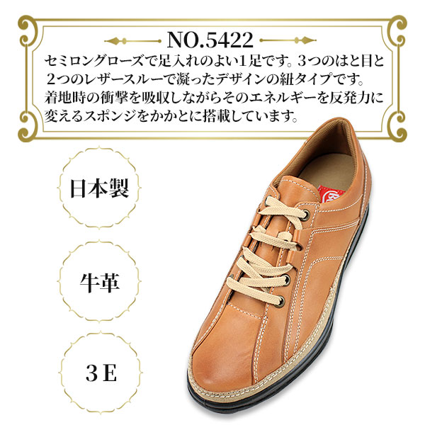 | 商品の特徴 | NO.5422 セミロングノーズで足入れのよい1足です。 3つのはと目と2つのレザースルーで凝ったデザインの紐タイプです。着地時の衝撃を吸収しながらそのエネルギーを反発力に変えるスポンジをかかとに搭載しています。日本製です。 足幅:3E ソール:ダイレクトウレタンソール 素材:牛革ナチュラルスムース | |