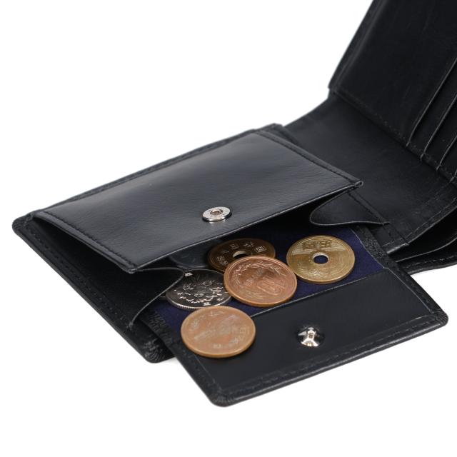 ソフトな手触りの牛革を使用した<コムサ・メン>の二つ折り財布です。見開きには、カードポケットとフラップ仕様の小銭入れをセット。仕切り付きの紙幣スペース部分にもカードポケットを備え、2枚のカードをしのばせて収納できます。オーソドックスなデザインは使い勝手も良好。機能性とデザイン性のバランスが良く、デイリーユースに好適なアイテムです。