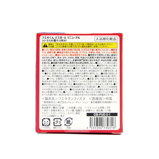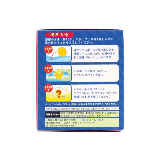 【マスコット主材質】TPR【成分】炭酸水素Na、クエン酸、硫酸Na、炭酸Na、酒石酸、シア脂、セルロースガム、PEG-400、香料、ラウリル硫酸Na、黄4【使用方法】・浴槽のお湯(約200L)に対して、本品1個を入れて、溶け終わってから入浴してください。