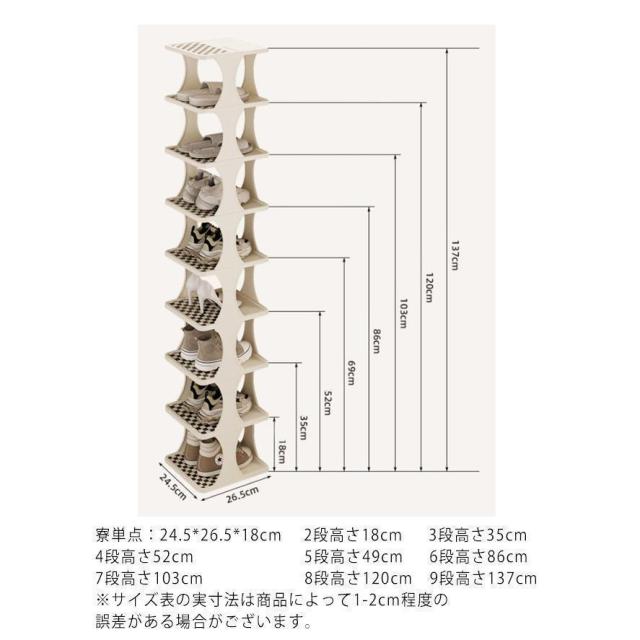 単点:24.5*26.5*18cm 2段高さ18cm 3段高さ35cm 4段高さ52cm 5段高さ49cm 6段高さ86cm 7段高さ103cm 8段高さ120cm 9段高さ137cm ※サイズ表の実寸法は商品によって1-2cm程度の誤差がある場合がございます。