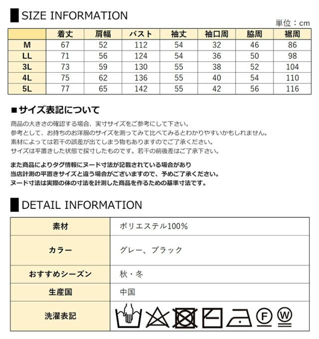 4L:着丈75 肩幅62 バスト136 袖丈55 袖口周40 脇周54 裾周110