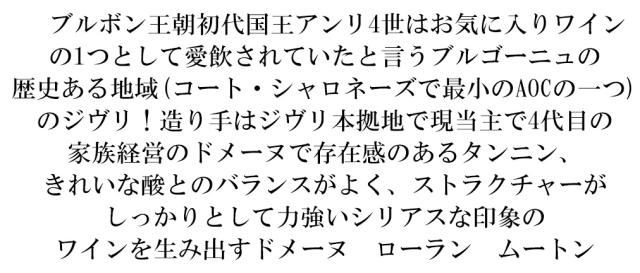 ブルボン王朝初代国王アンリ4世はお気に入りワイン の1つとして愛飲されていたと言うブルゴーニュの 歴史ある地域(コート・シャロネーズで最小のAOCの一つ) のジヴリ!造り手はジヴリ本拠地で現当主で4代目の 家族経営のドメーヌで存在感のあるタンニン、 きれいな酸とのバランスがよく、ストラクチャーが しっかりとして力強いシリアスな印象の ワインを生み出すドメーヌ ローラン ムートン