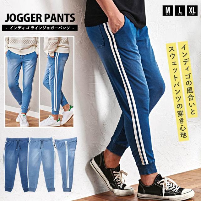 スウェットパンツ メンズ ジョガーパンツ スエットパンツ リブパンツ インディゴ 2本 ラインパンツ スキニーパンツ カットデニム デニムパンツ インディゴ 細身 タイト スポーツ CavariA 20代 30代 40代 ユニセックス 男性 男 服 秋 冬 秋冬 秋服 ファッション [CAGT24-20]
