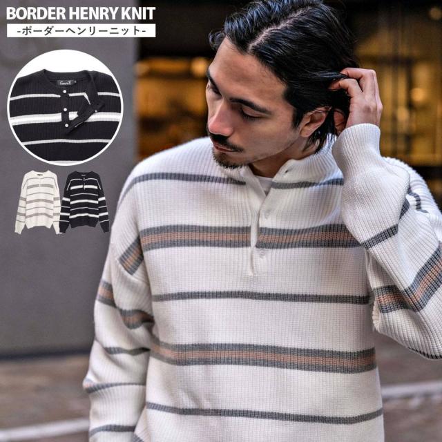 ニット メンズ ブランド おしゃれ セーター ヘンリーネック ボタン ボーダー ボーダーニット 長袖 ホワイト ベージュ ブラック 白 黒 M L CavariA キャバリア ブランド インナー カジュアル シンプル きれいめ 秋 冬 秋服 冬服 大人 カジュアルファッション [CARE24-32]