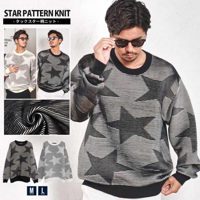 ニット メンズ セーター 長袖 スター柄 星柄 ブランド おしゃれ トレーナー あったか 暖かい 防寒着 大きいサイズ ざっくりニット ブラック ホワイト 黒 白 クルーネック CavariA 20代 30代 40代 ユニセックス 男性 男 服 秋 冬 秋冬 秋服 ファッション [CARE24-35]