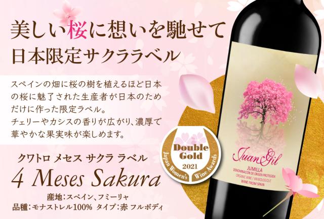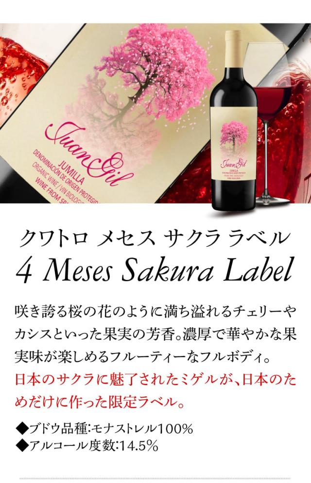 バリック4ヶ月熟成なので、その名も”4 Meses(=4ヶ月)”。シルバーラベルと同じ畑から造られたフアン・ヒルの新たなワインです。色の濃いチェリーやプラムのジャムに黒系スパイスやスモークのヒント。滑らかな完熟果実がアタックから感じられ、細かなタンニンとオークのニュアンスの骨格が味わいをしっかりと支えています。オークのニュアンスに彩られたフアンヒルの濃厚な果実感が堪能できます。