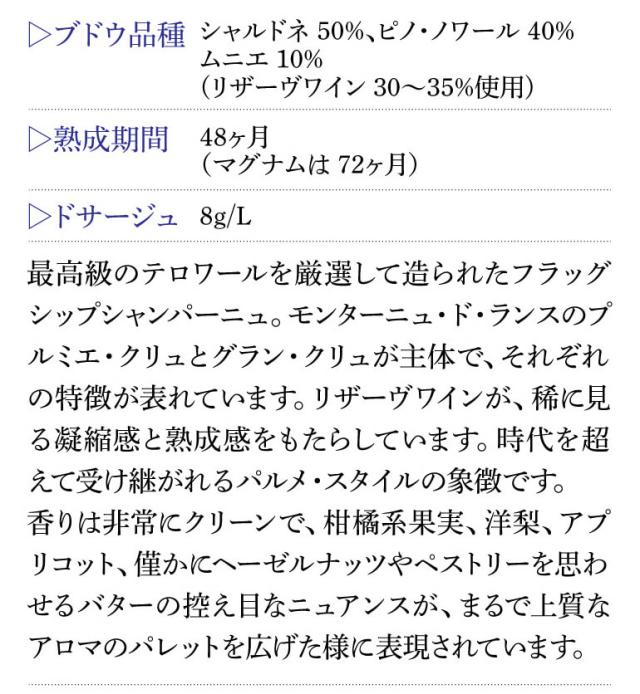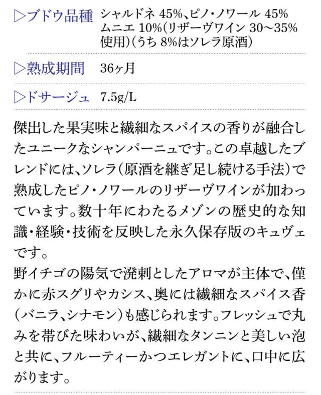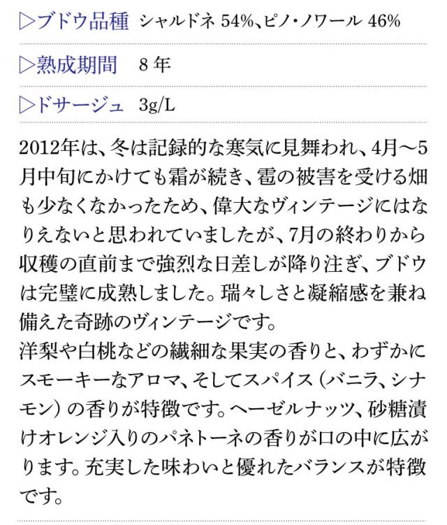 葡萄品種:シャルドネ50%、ピノ・ノワール50%(リザーヴワイン100%)