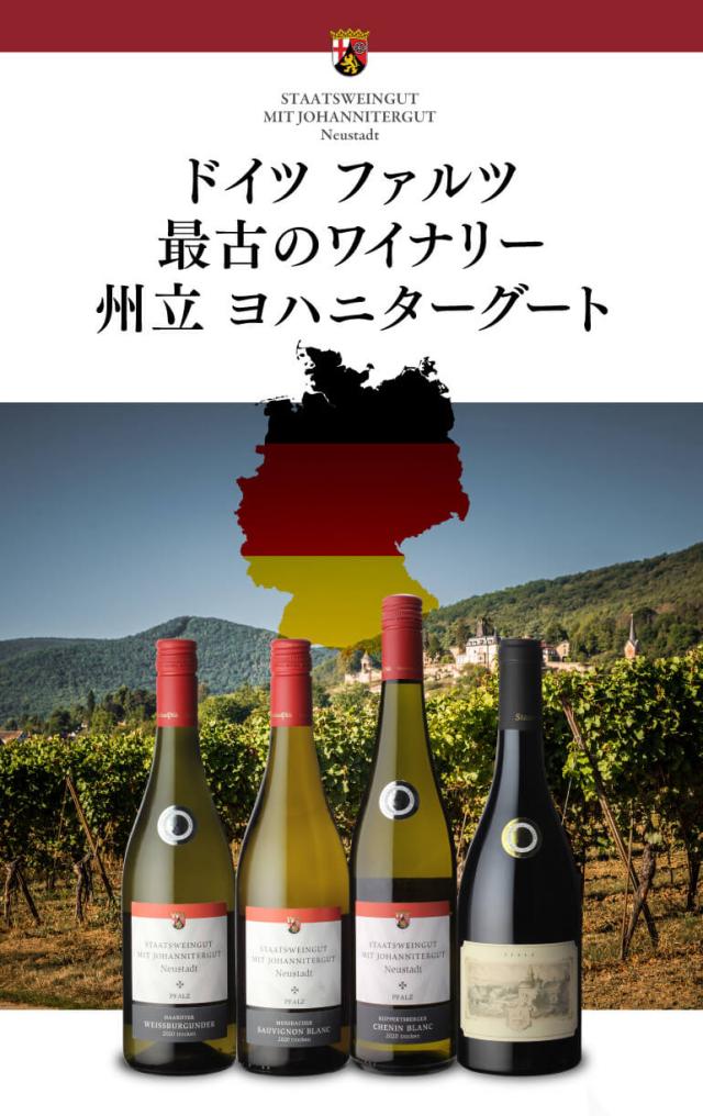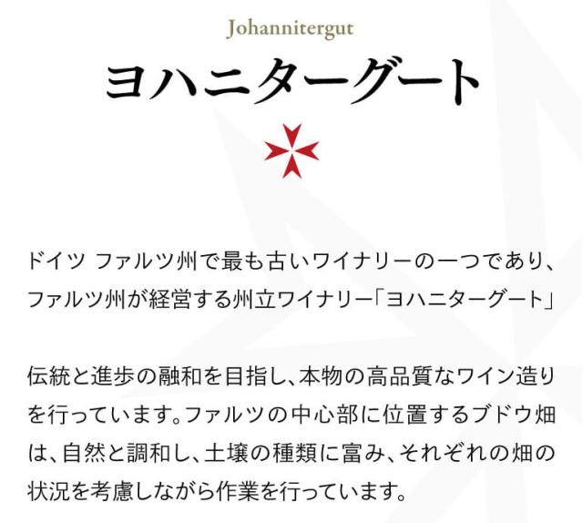 ドイツ ファルツ州で最も古いワイナリーの一つであり、ファルツ州が経営する州立ワイナリー「ヨハニターグート」伝統と進歩の融和を目指し、本物の高品質なワイン造りを行っています。ファルツの中心部に位置するブドウ畑は、自然と調和し、土壌の種類に富み、それぞれの畑の状況を考慮しながら作業を行っています。