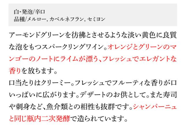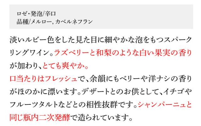 淡いルビー色をした見た目に細やかな泡をもつスパークリングワイン。ラズベリーと和梨のような白い果実の香りが加わり、とても爽やかです。口当たりはフレッシュで、余韻にもベリーや洋ナシの香りがほのかに漂います。デザートとのお供として、イチゴやフルーツタルトなどとの相性抜群です。シャンパーニュと同じ瓶内二次発酵で造られています。