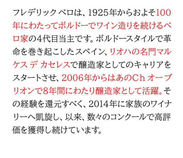 フレデリック・ベロはボルドーにある4世代続くワインメーカーです。20代前半にスペインのマルケス デ カセレスで醸造のキャリアをスタート、その後ボルドーのオーブリオンで8年間醸造家として活躍しました。現在は家族のワイナリーにて、これまでの経験からインスパイアされた先進的なワイン造りを行っています。