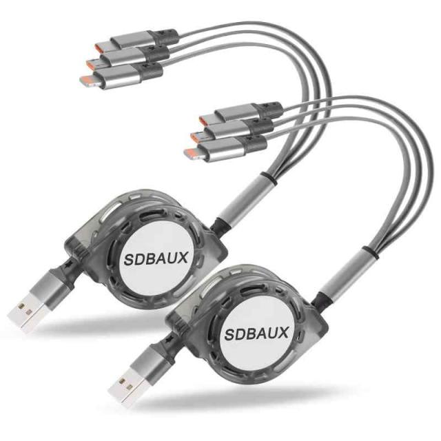 【2本セット】SDBAUXマルチ充電ケーブル 3in1 充電コード 巻き取り3A急速充電 ライトニングケーブル 携帯充電ケーブル スマホケーブルIP/Type C/Micro usb同時給電可能 多機種対応 (グレー)