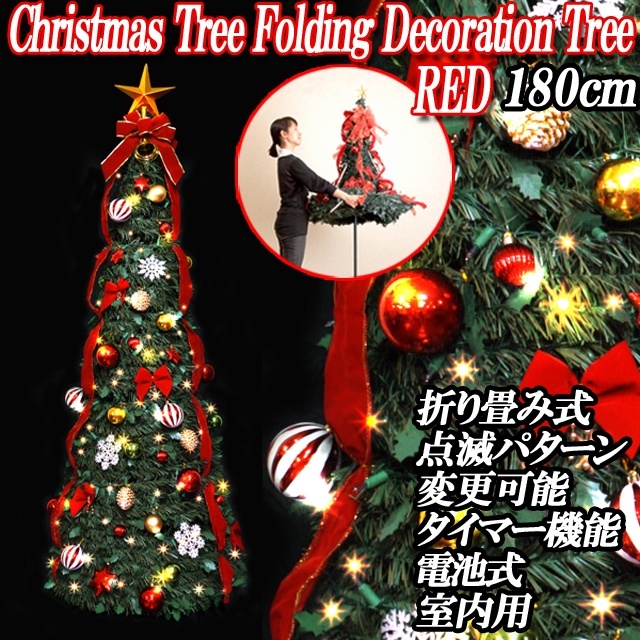 クリスマスツリー 折り畳みデコレーションツリー180cm/レッド(クリスマスツリー LEDフォールディングリボン 折りたたみ 組立簡単