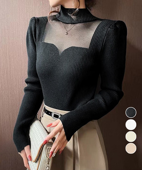 バストに巧みなシースルー切替デザインが施されたニットトップス