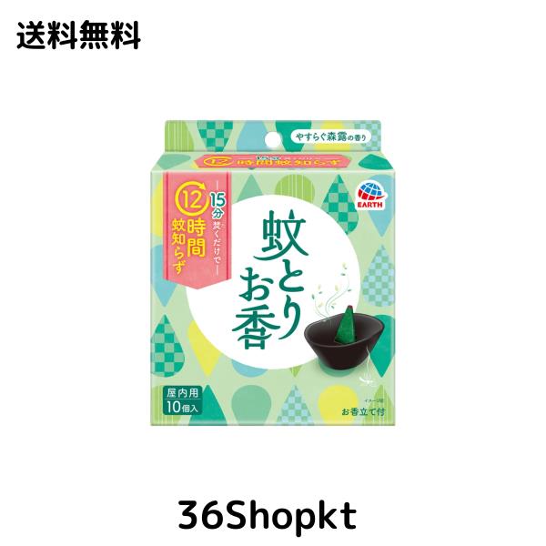 ◆商品名:アース渦巻香 蚊とりお香 やすらぐ森露の香り お香立て付 [10個入] 15分焚くだけ 効き目12時間 屋内用 蚊取り線香 虫よけ アロマ線香 (ア