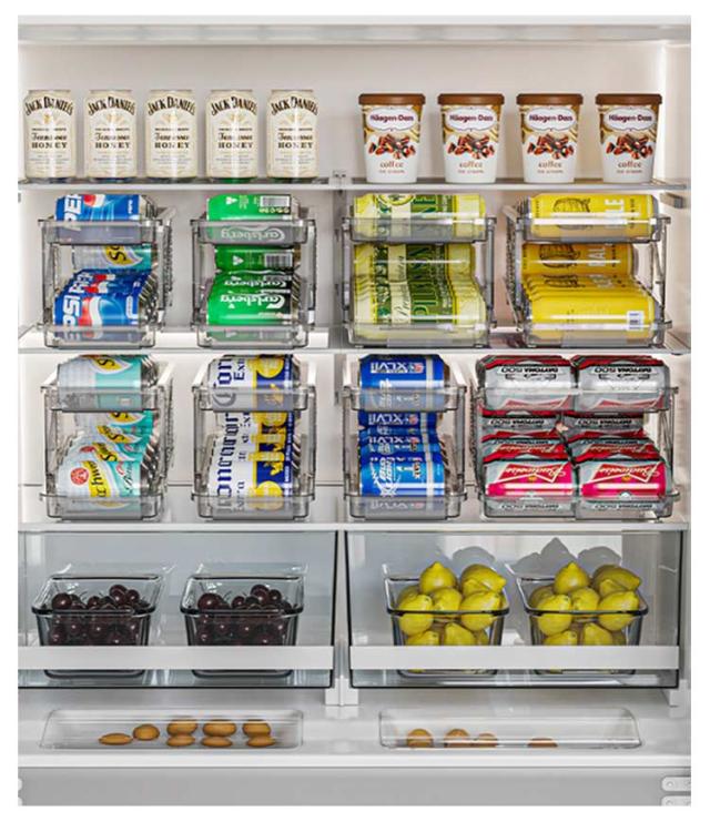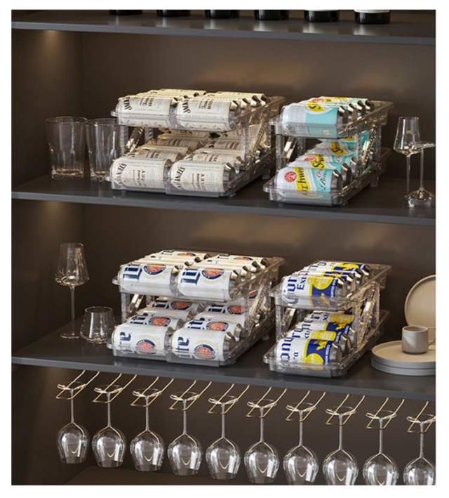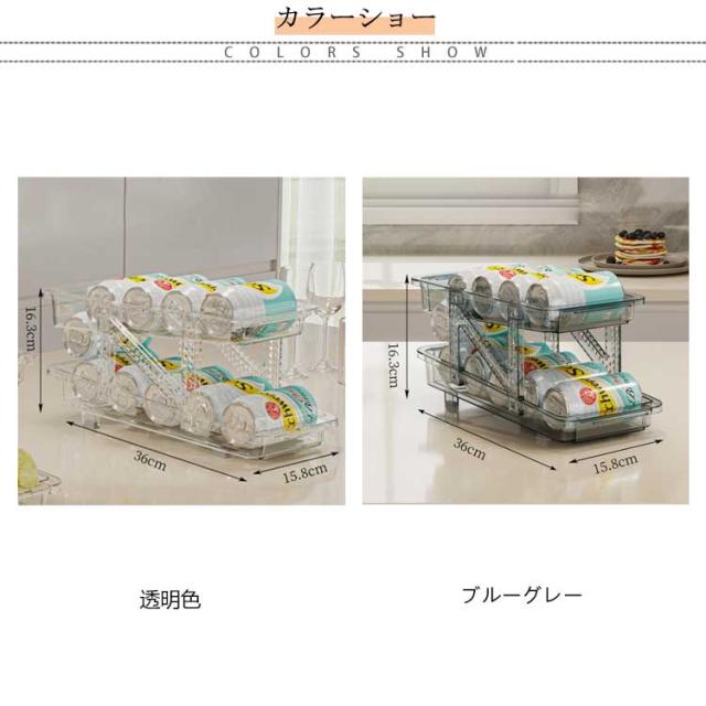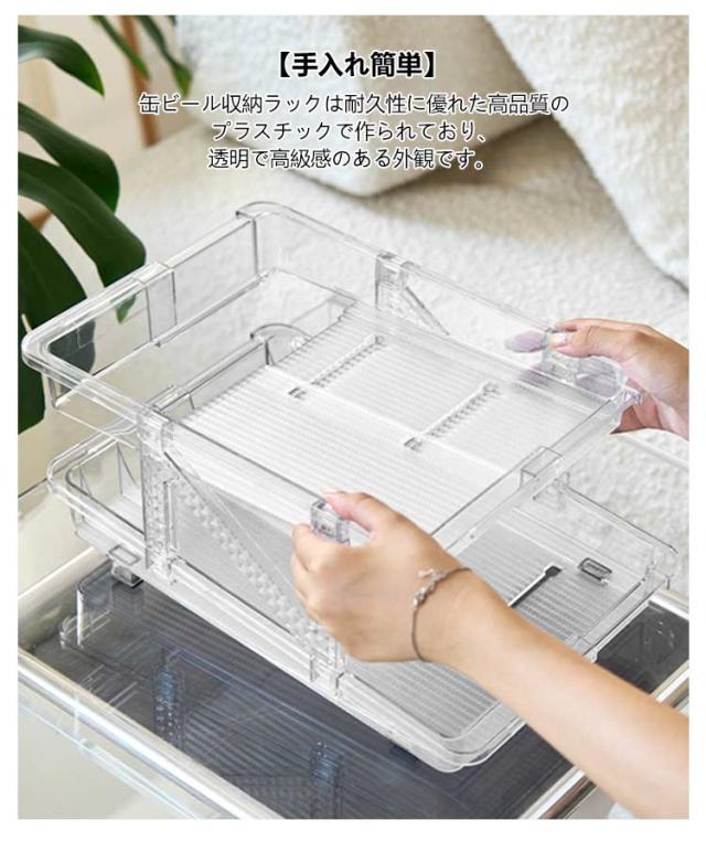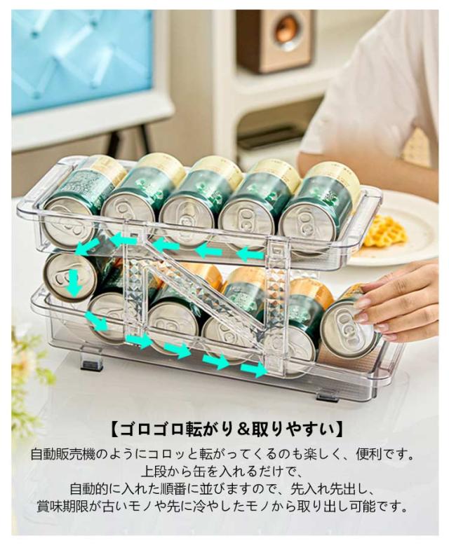 | 伸縮式&無段階調整 大容量で収納力抜群 飲料缶を最大11本収納可能 250ML/350ML/500ML飲料缶(直径5.7cm~6.6cm)に対応 【伸縮式&無段階調整】 冷蔵庫用缶ストッカー の幅は調整可能で、15.8cm〜23.8cmの間で自由に調整できます。したがって、この缶収納ラックは、飲料保管のさまざまな仕様に対応できます。市販されたほとんどの缶飲料(250ml 350ml 500ml)に対応しています。 【ゴロゴロ転がり&取りやすい】 自動販売機のようにコロッと転がってくるのも楽しく、便利です。上段から缶を入れるだけで、自動的に入れた順番に並びますので、先入れ先出し、賞味期限が古いモノや先に冷やしたモノから取り出し可能です。 【省スペース】 缶ストッカー二層スライドデザイン、非常に便利。より多くの飲料缶を収納できるだけでなく、缶を自動的に分配することもできます。飲料缶10本をストレスなく収納。250ml/350ml/500ml缶は冷蔵庫にすっきりと保管できるので、スペースを節約し、乱雑さとはおさらばできます。ビール、ジュース、コーヒー、コーラなどの缶入り飲料を収納して、冷蔵庫が一瞬でスッキリに整頓されました。 【手入れ簡単】 缶ビール収納ラックは耐久性に優れた高品質のプラスチックで作られており、透明で高級感のある外観です。 丸洗い可能でお手入れがとても簡単です。汚れた場合は、蛇口の下で洗い流すか、布で軽く拭くだけで清潔に保てます。 【幅広い使用シーン】 冷蔵庫だけでなく、テーブルの上で使用もでき、夏や冬にも大活躍缶ストッカー。冷蔵庫、リビング、キャビネット、ダイニングテーブルなどに置き、缶ビール、ジュース、コーヒー、コーラなどの缶飲料を収納して、冷蔵庫内をスッキリ整理できます。 | |