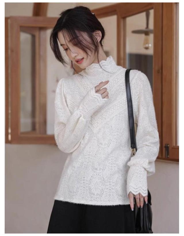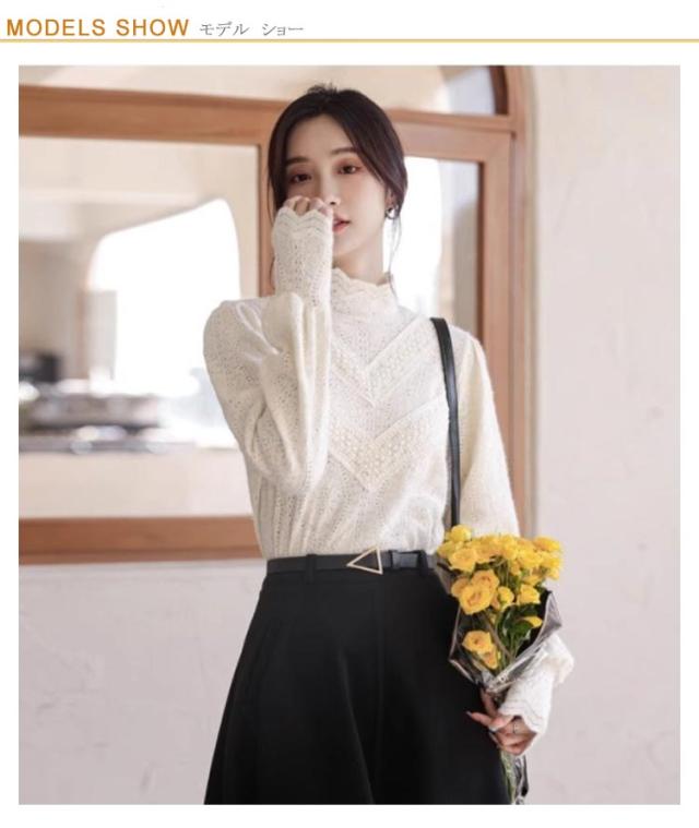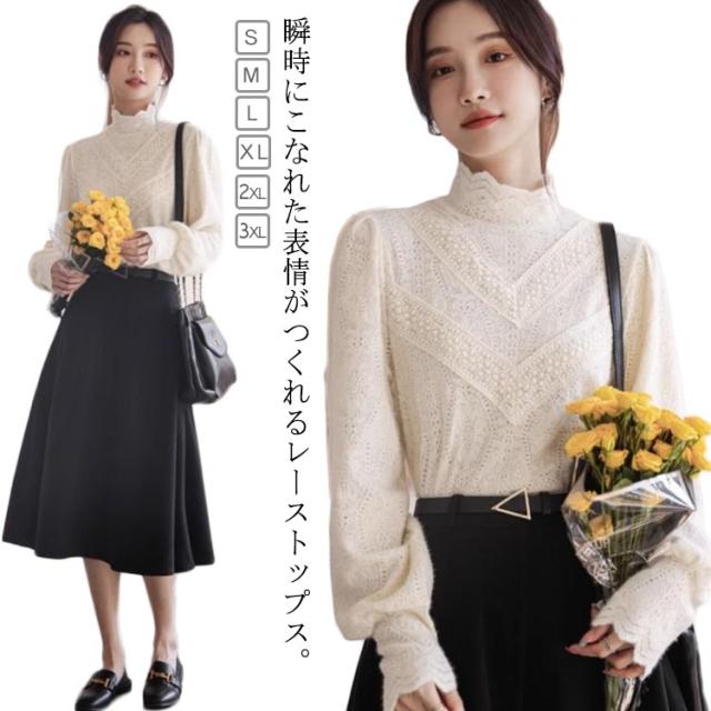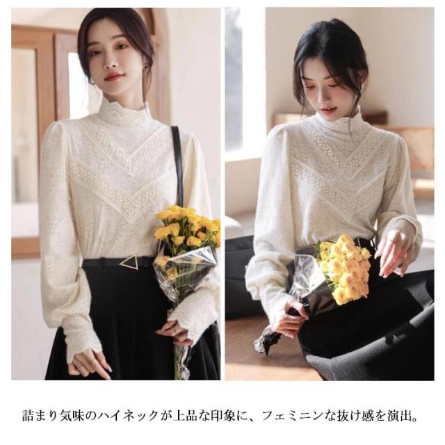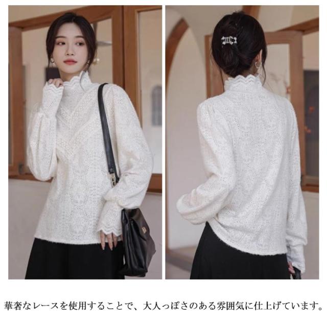フェミニン 切り替え レーストップス ボリュームスリーブ ハイネック ブラウス レースブラウス シアー 総レース 透け感 長袖 タートルネック レーストップス 春秋 カットソー プルオーバー インナー オフィス 通勤 あったか