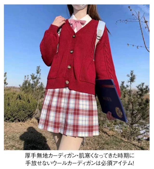 | シンプルなデザインとカラーバリエーションで校則のある学校も安心です。 ケーブル編みがシンプルで大人っぽい印象の綿カーディガンです。 落ち着いたカラーバリエーションで揃えているので、学校の制服にも合わせやすいです。 厚手無地カーディガン・肌寒くなってきた時期に手放せないウールカーディガンは必須アイテム! | |